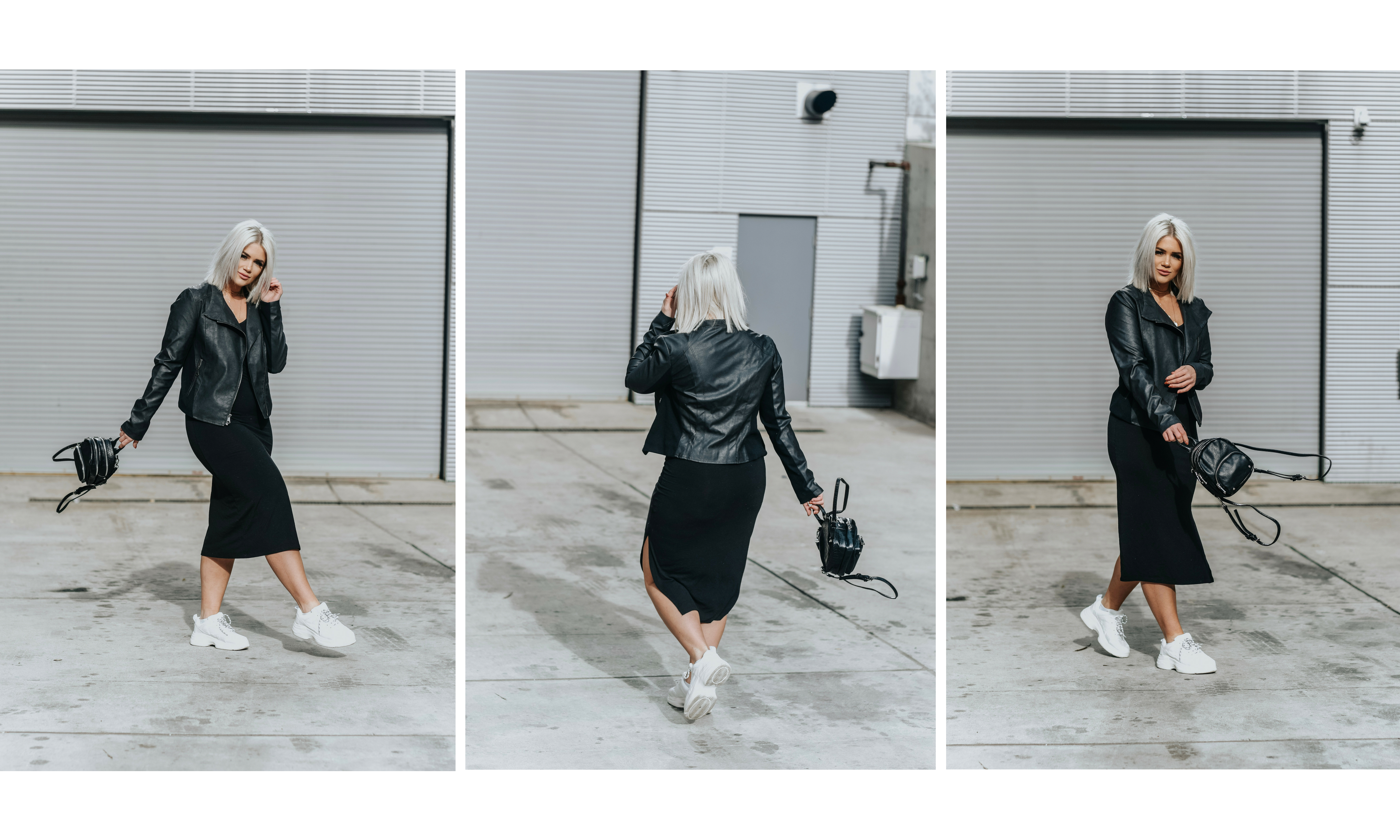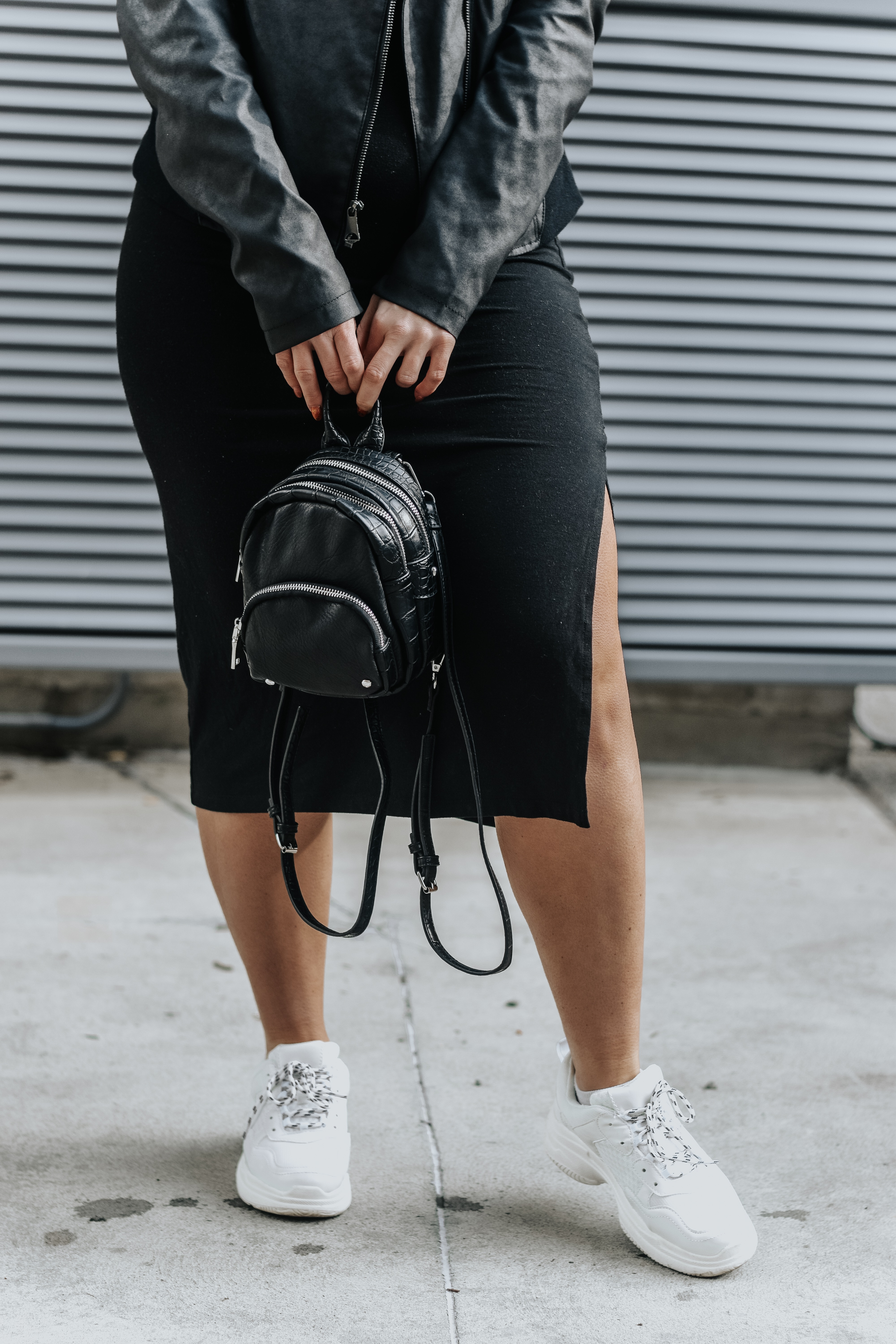 I love styling these shoes with dresses! I just think the combo of girly + sporty (like I mentioned before) is so cute. I’ve seen people do babydoll dresses but I decided to go with a black midi dress, faux leather jacket, my favorite mini backpack and the same necklaces are above.